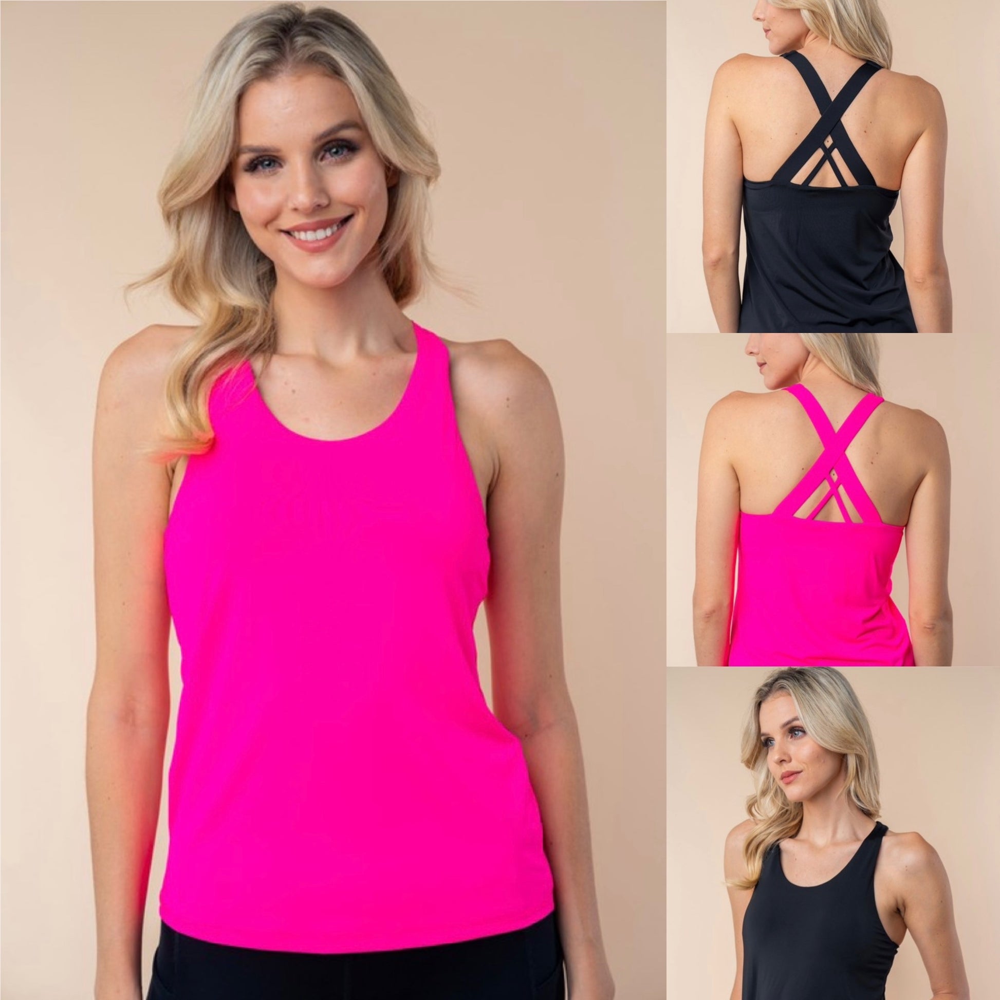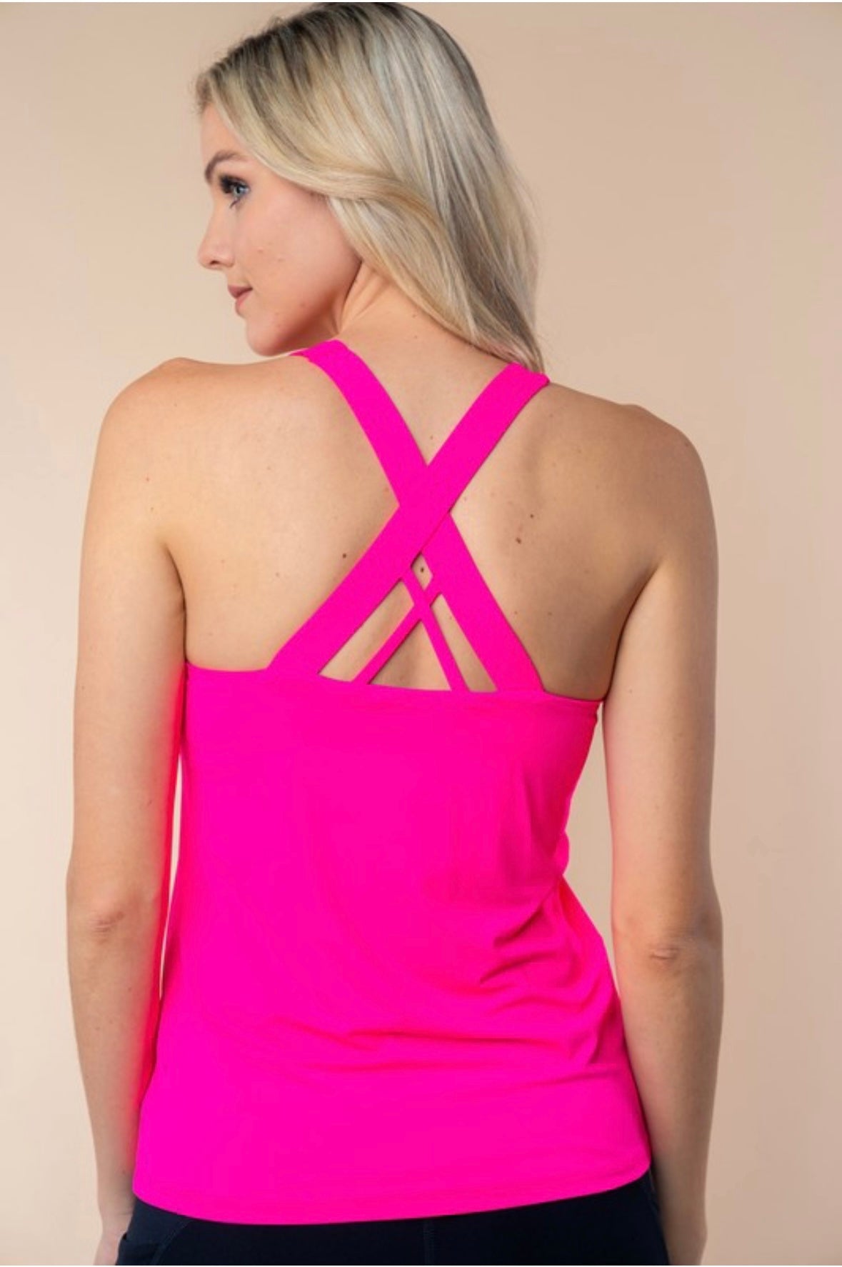The Explorer is an active top with a round neck featuring bra cups and a cross strap back. Fabric is a lightweight performance knit.