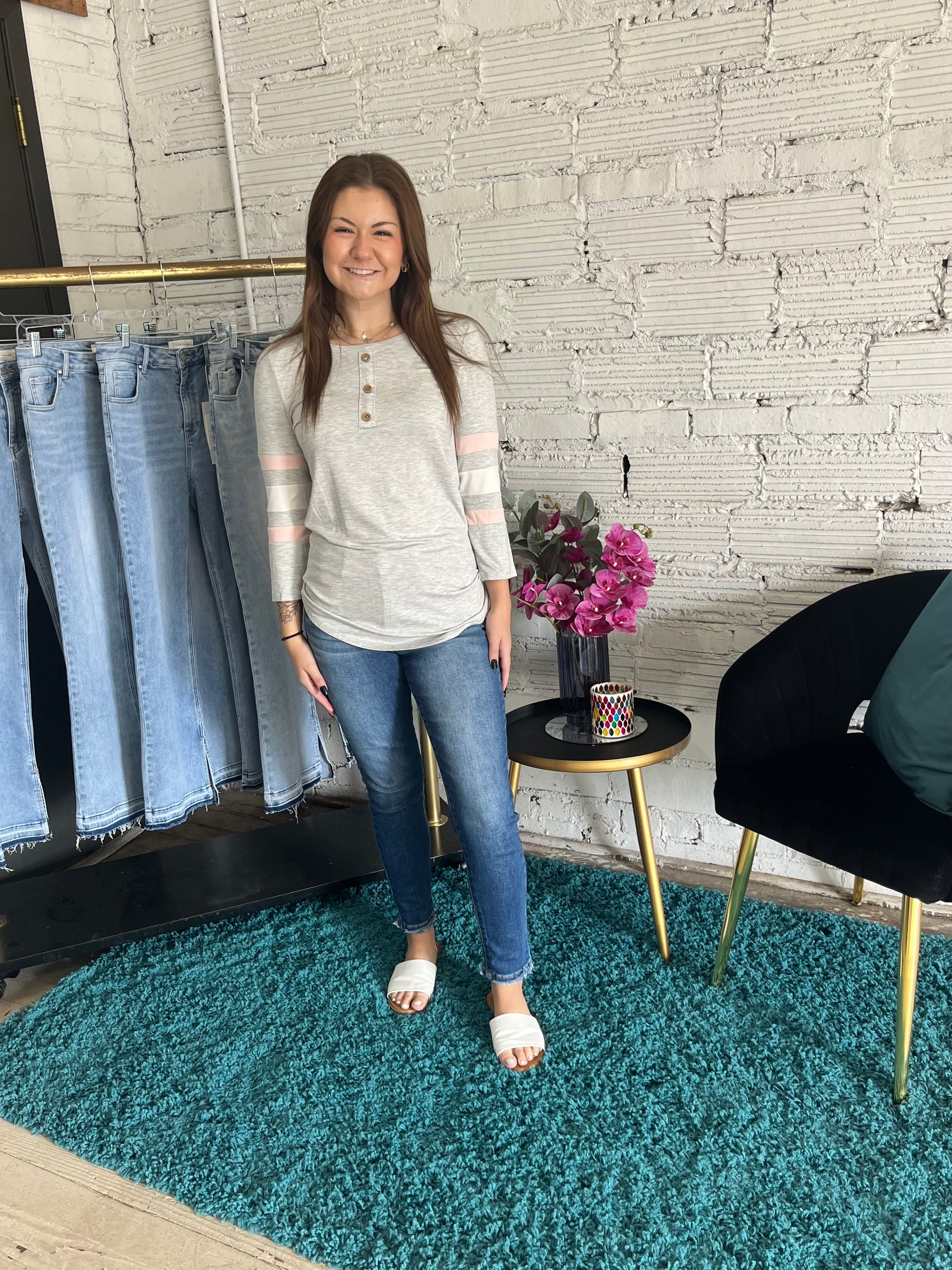 This top features button details and contrasting colored stripes at the sleeves. It brings the perfect amount of fund for your every day.