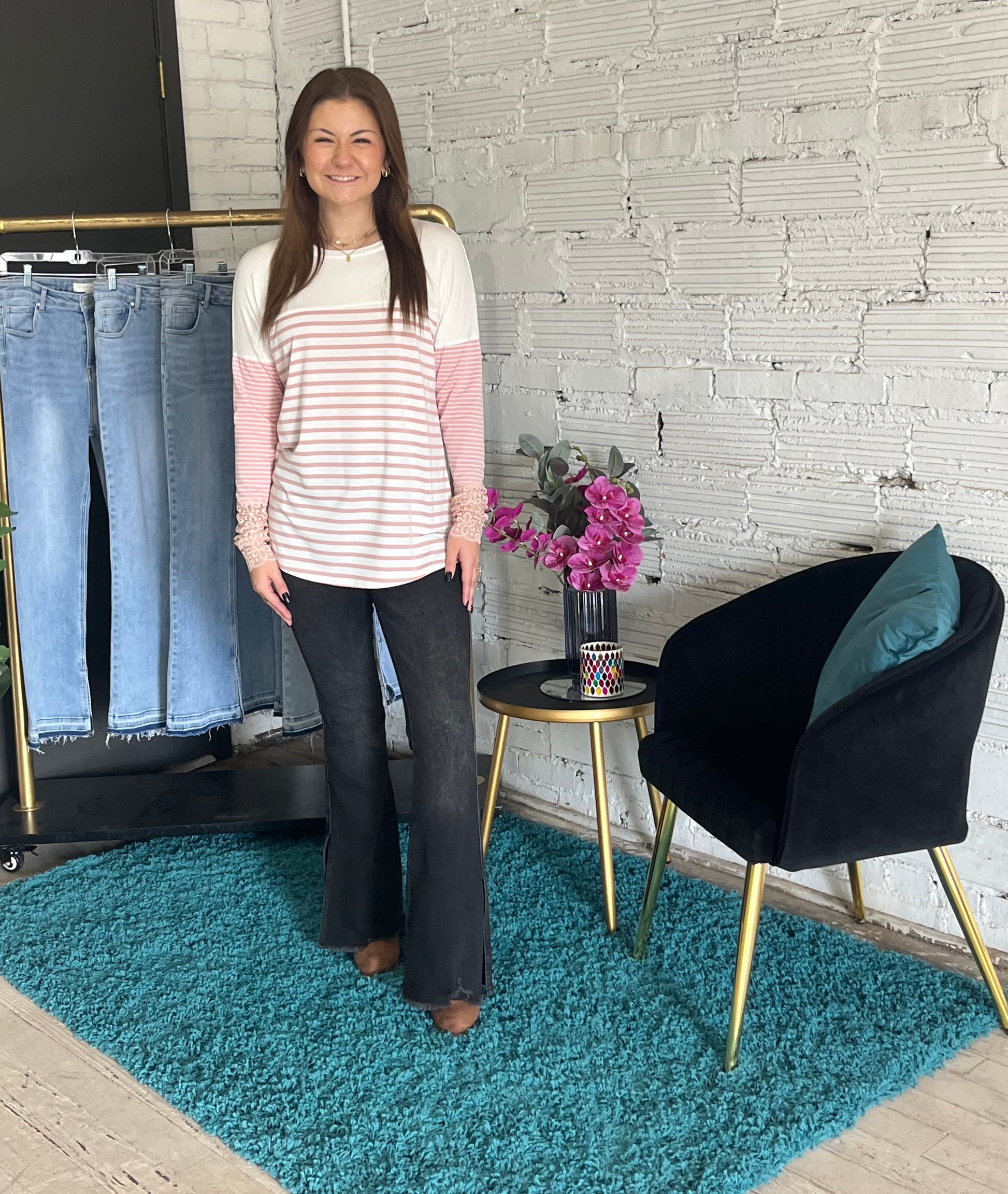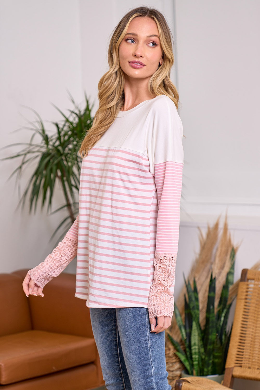 Featuring three different fabrics, this top gives the most! With striping and lace, it's 100% irresistible to the eyes.