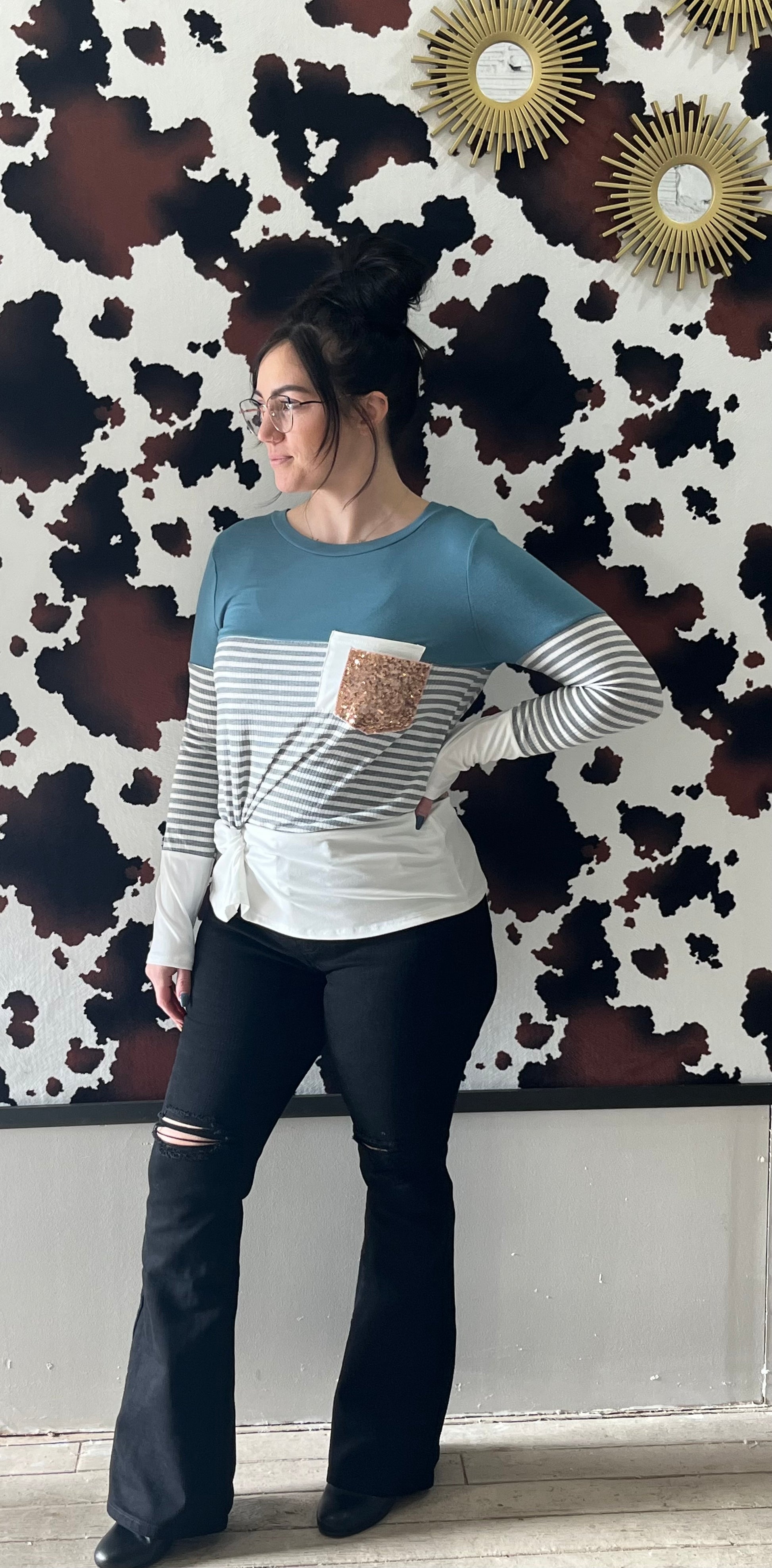 This top is hands down a favorite! The sequins make it easy to dress up or keep it casual. It features striping and colorblock detail. It simply doesn't fall short.